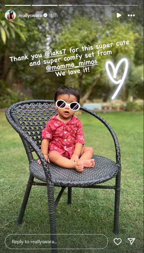 स्वरा भास्कर ने अपनी बेटी की एक फोटो इंस्टा स्टोरी में पोस्ट की है। जिसमें राबिया गार्डन के बीच में कुर्सी पर बैठी हुई दिख रही है। पिंक कलर का को-ऑर्ड सेट पहने और आंखों पर काला चश्मा लगाए स्वरा की बेटी बेहद क्यूट लग रही हैं। पोस्ट को शेयर करते हुए एक्ट्रेस ने कैप्शन में लिखा, "इस सुपर क्यूट और सुपर कम्फर्टेबल सेट के लिए शुक्रिया... हमें ये बेहद पसंद है।"