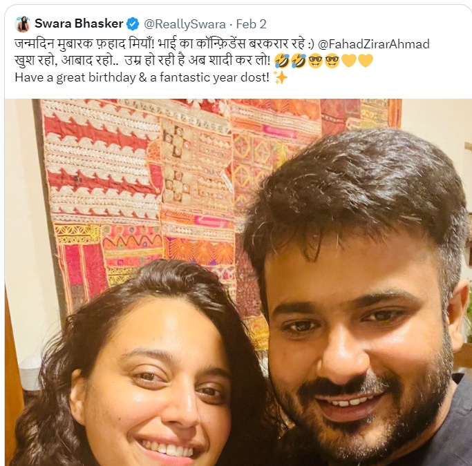 2 फरवरी, 2023 को स्वरा और फहद के बीच ट्विटर पर एक हल्का फुल्का मजाक हुआ। फहद का बर्थडे था और स्वरा ने समाजवादी पार्टी के यूथ विंग, समाजवादी युवजन सभा के प्रदेश अध्यक्ष को हार्दिक शुभकामनाएं दीं थीं। स्वरा ने ट्वीट में लिखा, 'हैप्पी बर्थडे फहाद मियां! भाई का आत्मविश्वास बरकरार रहे, फहद अहमद खुश रहो, सेटल हो जाओ.. तुम बूढ़े हो रहे हो, अब शादी करो! तुम्हारा बर्थडे और साल, शानदार रहे दोस्त।'