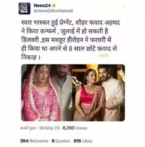हुआ ये कि सोशल मीडिया पर एक स्क्रीनशॉट जमकर वायरल हो रहा है। इस कथित ट्वीट के स्क्रीनशॉट में दावा किया जा रहा है कि स्वरा भास्कर प्रेग्नेंट हैं। वायरल होते-होते जब ये खबर संबंधित न्यूज पोर्टल तक पहुंची, तो उन्होंने ऑफिशियली ट्वीट करके दावा किया ये खबर पूरी तरह से फर्जी है। तब जाकर सोशल मीडिया यूजर्स ने राहत की सांस ली और एक्ट्रेस से सवाल पूछना बंद किया।