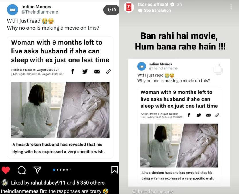 इंस्टाग्राम पर द इंडियन मीम्स एकाउंट से कुछ मीम्स शेयर किये गये, जिनमें से एक में एक खबर शेयर की गयी है। इस खबर के मुताबिक, एक महिला के पास 9 महीने की जिंदगी बची है और वो अपने प्रेमी के साथ आखिरी बार वक्त बिताने की इजाजत पति से मांग रही है। इसे शेयर करते हुए हुए कमेंट किया गया-