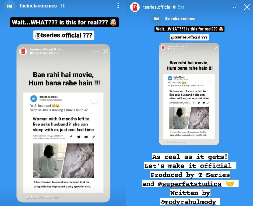 ''अभी-अभी मैंने क्या पढ़ लिया। इस पर कोई फिल्म क्यों नहीं बना रहा? इसको स्टोरी में शेयर करते हुए टी-सीरीज के एकाउंट से लिखा गया- बन रही है मूवी, हम बना रहे हैं। इस पोस्ट में टी-सीरीज ने अपने पार्टनर प्रोडक्शन हाउस सुपरफैट स्टूडियोज को भी टैग किया है।''