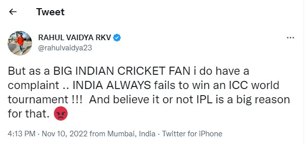 राहुल वैद्य यही पर शांत नहीं हुए, उन्होंने अपने अगले ट्वीट में एक इंडियन क्रिकेट फैन के रूप में अपनी शिकायत सामने रखी। सिंगर ने ट्वीट करते हुए लिखा, 'लेकिन इंडियन क्रिकेट टीम का एक बड़ा फैन होने के नाते मेरी एक शिकायत है। इंडिया आईसीसी वर्ल्ड टूर्नामेंट में हमेशा हार जाती है। आप चाहे इस बात पर विश्वास करें या ना करें इसकी एक बड़ी वजह आईपीएल है।