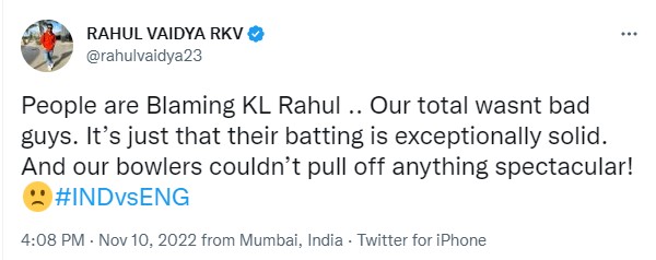 सोशल मीडिया पर मैच हारने के बाद जहां फरहान अख्त्तर, अर्जुन रामपाल और अजय देवगन सहित कई सितारे इंडियन टीम का हौंसला बढ़ाते हुए नजर आए। तो वही सोशल मीडिया यूजर्स के अलावा कई सितारों ने इंडिया की हार पर अपनी निराशा साफ तौर पर जाहिर की। हाल ही में बिग बॉस के एक्स कंटेस्टेंट राहुल वैद्य ने दो ट्वीट किए। पहले ट्वीट में वह केएल राहुल के समर्थन में खड़े दिखाई दिए। उन्होंने लिखा, 'लोग केएल राहुल को ब्लेम कर रहे हैं। हम पूरी तरह से भी बुरे नहीं थे। बात सिर्फ ये है कि उनकी बैटिंग बहुत ही ज्यादा मजबूत थी। हमारे गेंदबाजों ने भी उनके आगे हार नहीं मानी और शानदार खेला'।