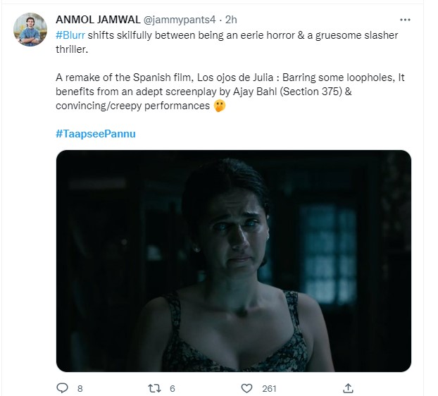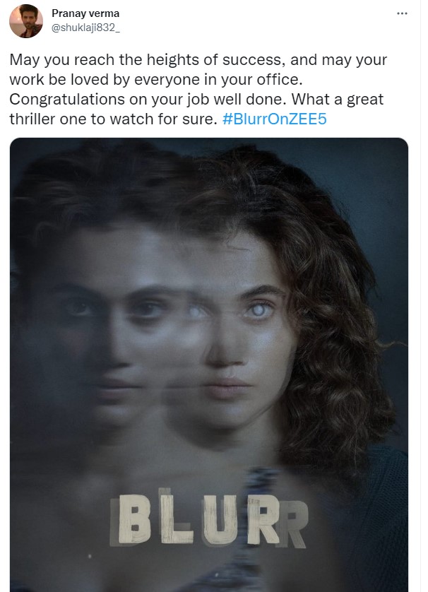 वहीं '#Blurr मुझे यह मूवी बहुत पसंद आई। फिल्म के आखिरी 30 मिनट डरावने हैं। फिल्म के सभी के एक्टर्स ने बढ़िया काम किया है...#TaapseePannu'