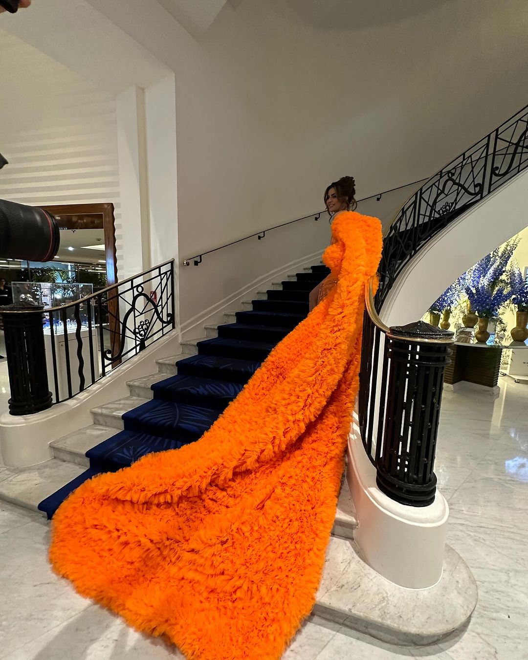 एक्ट्रेस के लुक की बात करें तो वह ऑरेंज कलर के फुल स्लीव्स गाउन में नजर आईं, जिसे उन्होंने लॉन्ग ट्रेल वाले श्रग के साथ कैरी किया हुआ था। इस ड्रेस के अपर पोर्शन को कोर्सेट डिजाइन में ऑफ शोल्डर रखा गया था। साथ ही हाई थाई वाले इस स्लिट कट दिया गया है।
