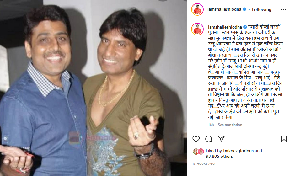 एक्टर शैलेश लोढ़ा ने इंटाग्राम अकाउंट पर राजू श्रीवस्तस संग अपनी एक सालों पुरानी तस्वीर शेयर कर लंबा चैड़ा नोट लिखा है। उन्होंने लिखा, ‘हमारी दोस्ती बरसों पुरानी... स्टार प्लस के एक शो कॉमेडी का महा मुकाबला में जिस वक्त हम साथ थे तब राजू श्रीवास्तव ने एक एक्ट में एक चरित्र किया था जो बड़े ही खास अंदाज में ‘आओ आओ‘ बोला करता था... उस दिन से उन का नंबर मेरे फोन में ‘राजू आओ आओ‘ नाम से ही संग्रहित है। आज सारी दुनिया कह रही है... आओ आओ...वापिस आ जाओ...अद्भुत कलाकार... कमाल के मित्र... राजू भाई... ऐसे रुला के जाओगे... ये नहीं सोचा था... उस दिन एम्स में भाभी और परिवार से मुलाकात की तो विश्वास था कि जल्द ही आओगे आप स्वस्थ होकर किन्तु आप तो अनंत यात्रा पर चले गए...ईश्वर आप को अपने चरणों में स्थान दे... हास्य के क्षेत्र की इस क्षति को कभी पूरा नहीं जा सकेगा।'
