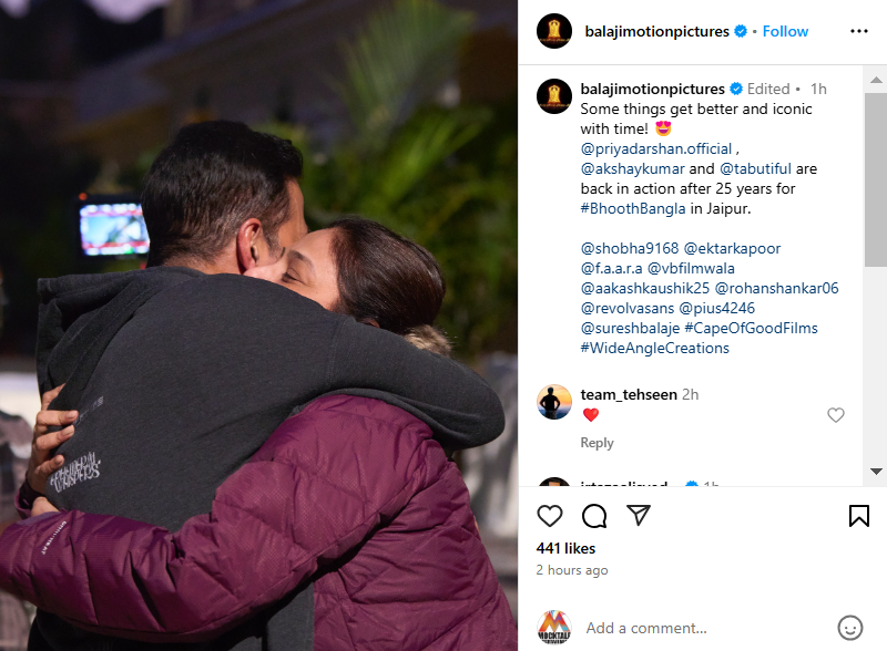 इस फोटो को इंस्टाग्राम पर शेयर करते हुए मेकर्स ने कैप्शन में लिखा, "कुछ आइकॉनिक चीजें समय के साथ और भी बेहतर हो जाती हैं। प्रियदर्शन, तब्बू और अक्षय कुमार की जोड़ी 25 साल बाद फिर से जयपुर में 'भूत बंगला' में दिखाई देगी"। आपको बता दें कि फिल्म की शूटिंग जयपुर में चल रही है।
