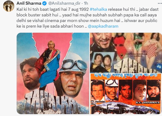 एक्स प्लेटफॉर्म पर अनिल शर्मा ने ट्वीट किया, 'कल की ही तो बात लगती है 7 अगस्त, 1992 #tehelka रिलीज हुई थी...जबरदस्त ब्लॉकबस्टर साबित हुई...याद है मुझे सुबह-सुबह पापा का कॉल आया दिल्ली से विशाल सिनेमा पर सुबह के शो में हुजूम है...ईश्वर और पब्लिक के इस प्रेम के लिए सदा आभारी हूं।'