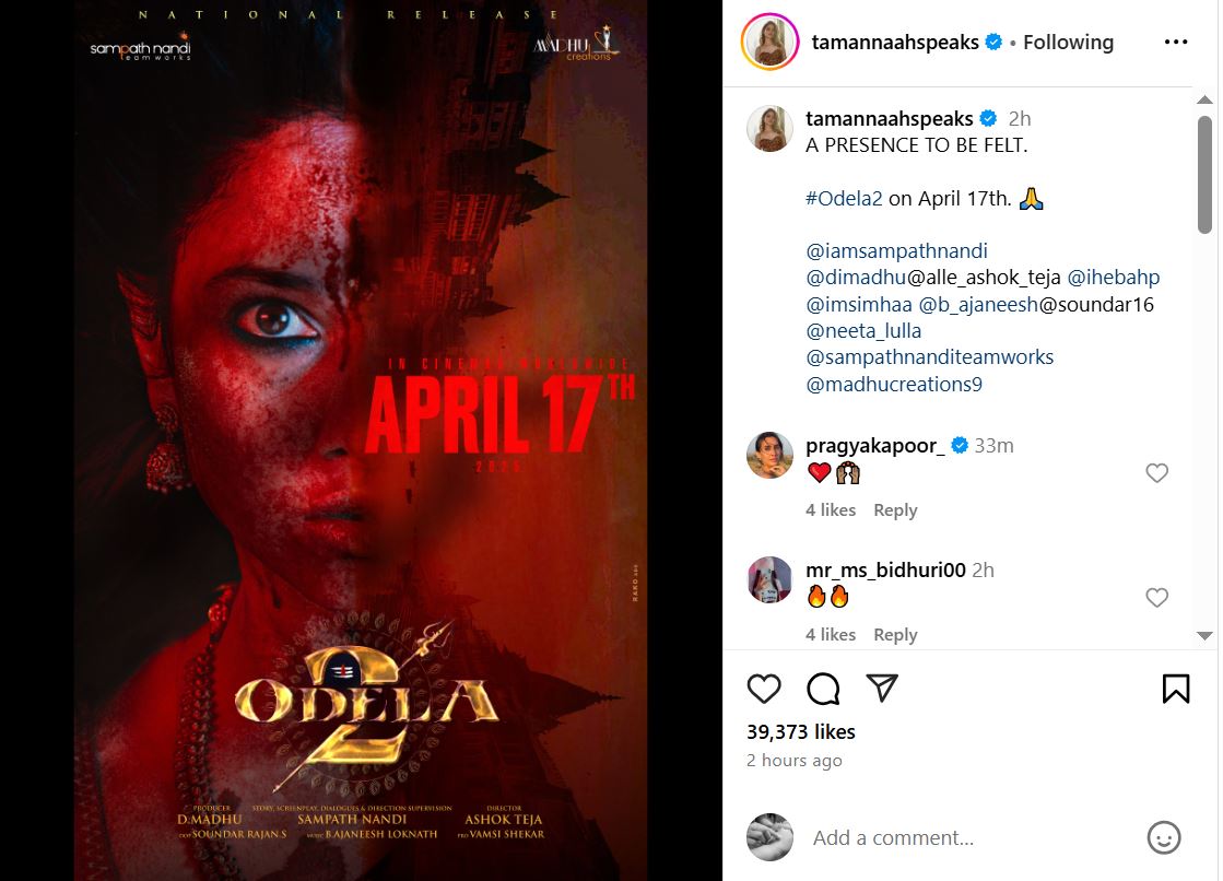 तमन्ना ने ओडेला 2 की रिलीज का एलान करते हुए अपने इंस्टाग्राम हैंडल पर एक पोस्ट शेयर किया है। पोस्ट में एक्ट्रेस ने लिखा, "जब अंधकार छा जाता है और आशा धूमिल हो जाती है, तो 'शिव शक्ति' जागती है। ओडेला 2 17 अप्रैल को दुनिया भर में रिलीज होगी।" फैंस को फिल्म से काफी उम्मीदें हैं, यह ओडेला फ्रैंचाइजी की दूसरा पार्ट है, जिसके पहले पार्ट का नाम ओडेला रेलवे स्टेशन था।