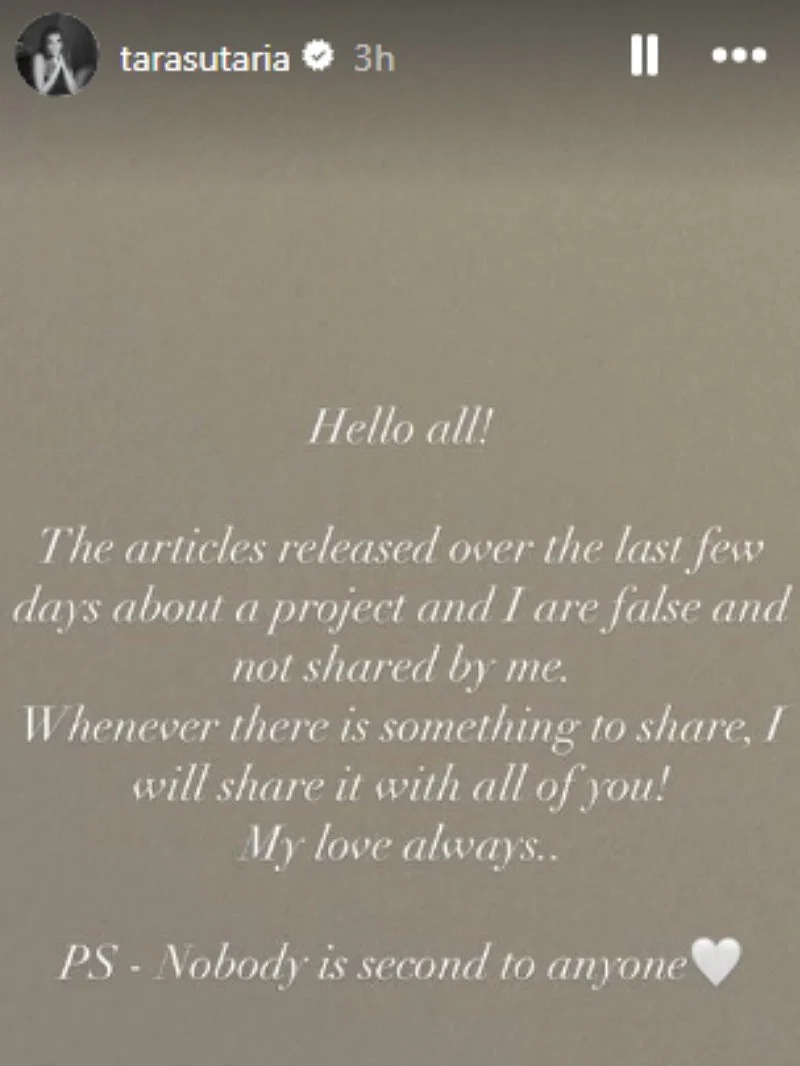 अपनी इंस्टाग्राम स्टोरी में तारा ने इस बात को कंफर्म किया कि वो यश के साथ किसी प्रोजेक्ट पर काम नहीं कर रही हैं। उन्होंने लिखा, "हेलो ऑल! पिछले दिनों मैंने कई ऐसे आर्टिकल पढ़े जिसमें मेरा नाम एक प्रोजेक्ट से जोड़ा जा रहा था। आपको बता दूं कि ये मैंने शेयर नहीं किया है। अगर कभी ऐसा कुछ होगा तो मैं आपके साथ शेयर करूंगी। सभी को मेरा प्यार।"