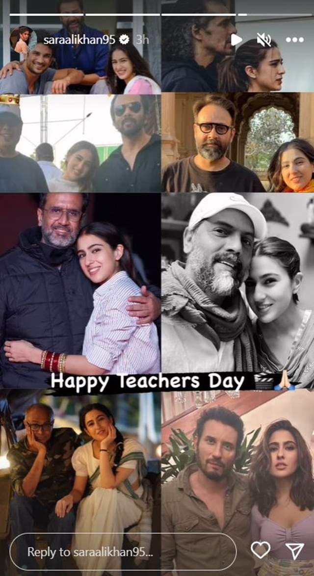 अनुपम खेर और काजोल के अलावा सारा अली खान ने भी अनोखे अंदाज में टीचर्स डे का जश्न मनाया है। सारा ने अपने ऑफिशियल इंस्टाग्राम हैंडल पर स्टोरी में आनंद एल राय, रोहित शेट्टी और इम्तियाज अली जैसे हिंदी सिनेमा के तमाम