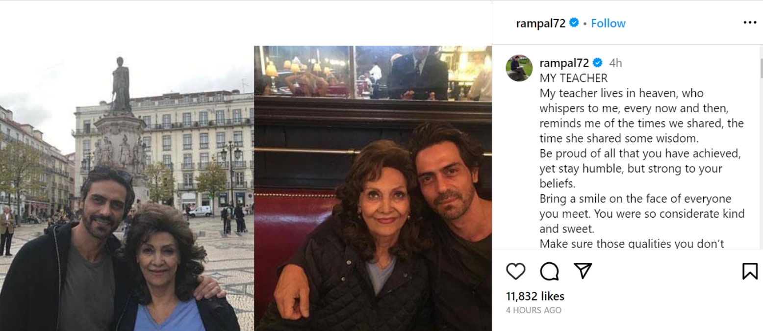 अर्जुन रामपाल ने अपनी दिवंगत मां को याद करते हुए उन्हें श्रद्धांजलि दी। अर्जुन ने अपने नोट में लिखा- मेरी टीचर स्वर्ग में रहती हैं, जो अक्सर मुझसे बातें करती हैं। मुझे हमेशा उस दौर की याद दिलाती हैं, जब मेरे साथ विवेक की बातें शेयर ती थीं। जो हासिल किया, उस पर गर्व करो, मगर विनम्र बने रहो और अपने उसूलों पर कायम रहो।