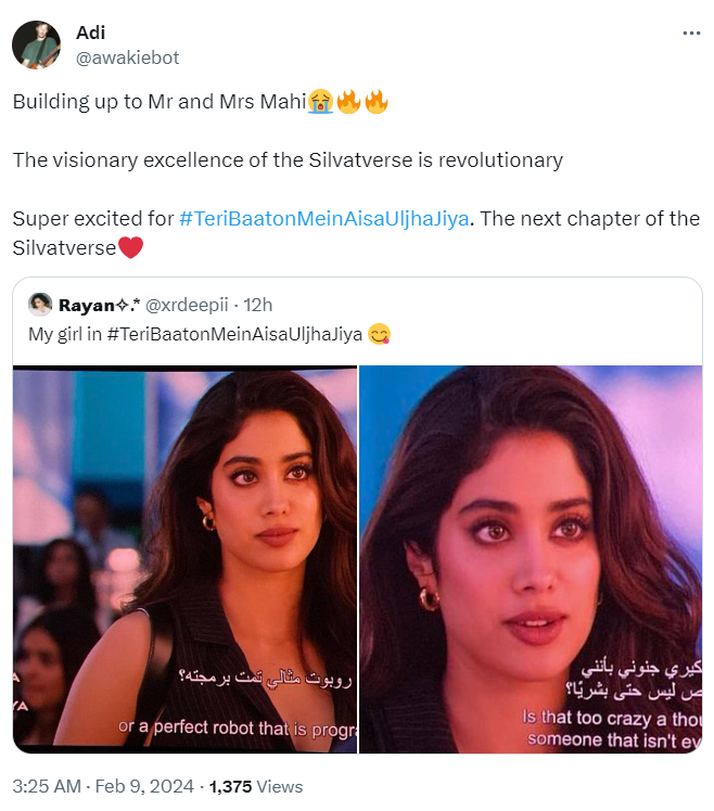 तेरी बातों में ऐसा उलझा जिया लोगों को बेहद पसंद आ रही है। इस रोमांटिक कॉमेडी फिल्म में शाहिद कपूर कृति के प्यार में उलझते हुए नजर आ रहे हैं, जो मूवी में एक रोबोट बनी हुई हैं।