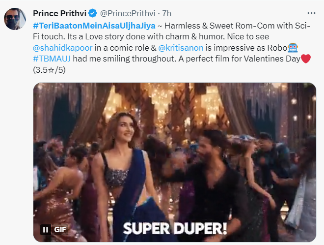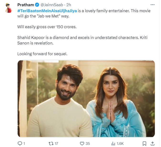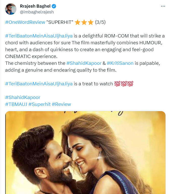 दूसरे यूजर ने शाहिद-कृति की फिल्म के तारीफों के पुल बांधते हुए लिखा, "तेरी बातों में उलझा जिया एक मजेदार रॉम-कॉम है, जिसमें प्यार के चार्म और दिमाग के साथ-साथ भरपूर प्यार भी दिखाया गया है। फिल्म की स्टोरी लाइन काफी अच्छी है"।