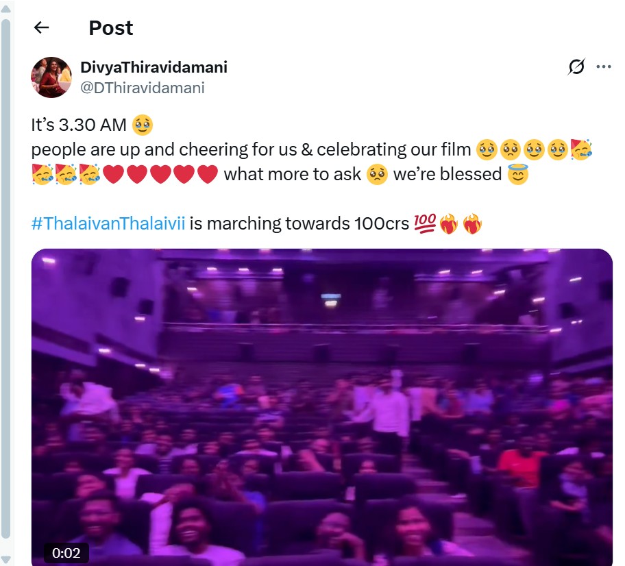 एक यूजर ने X (पहले ट्विटर) पर लिखा:“#ThalaivanThalaivii इंटरवल। आकर्षण, कॉमेडी और मनमोहक संगीत से भरपूर एक सहज पहला भाग!विजय सेतुपति एक प्यारे से किरदार में चमकते हैं। नित्या मेनन के हिस्से बेहतीन हैं। कॉमेडी टाइमिंग कमाल की है - खासकर सहायक कलाकारों के साथ। अब दूसरा भाग ही सबसे महत्वपूर्ण है।”
