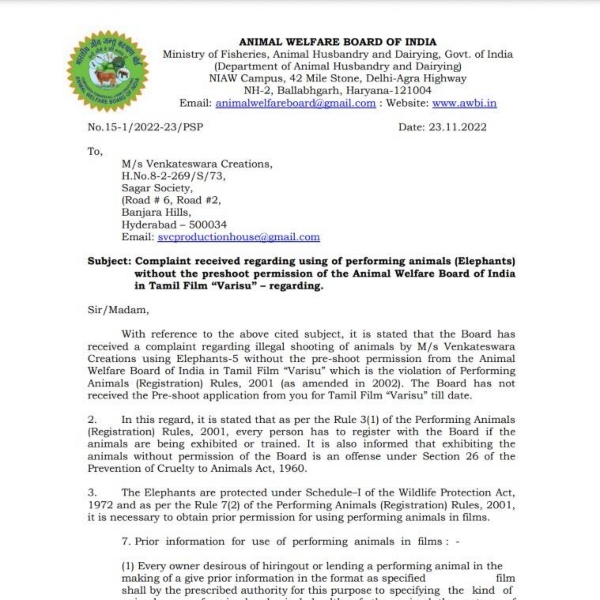 इंडियन एक्सप्रेस की रिपोर्ट्स के मुताबिक, एनिमल वेलफेयर बोर्ड के अधिकारियों ने फिल्म मेकर्स को नोटिस भेजा है और महज 7 दिनों के अंदर जवाब देने को कहा है। इतना ही नहीं अगर मेकर्स ने इस नोटिस का जवाब नहीं दिया तो उनके खिलाफ कानूनी कार्रवाई होगी। हालांकि, वारिसु के मेकर्स ने अभी तक इस नोटिस पर कोई स्टेटमेंट जारी नहीं किया है। बता दें ये फिल्म डायरेक्टर वम्सि पैदिपल्ली बना रहे हैं और इसका बजट 200 करोड़ रुपए हैं।