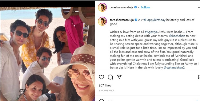 साथ ही उन्होंने इस बात की भी जानकारी दी कि है उन्हें अगस्तस्य नंदा अभिषेक बच्चन कि तरह लगते हैं। उन्होंने लिखा है, 'आप सेट पर मेरा मजाक उड़ा रहे थे। आपको देखकर मुझे अभिषेक की बात याद आती हैं। आप बहुत विनम्र हो और आप में बहुत प्रतिभा है।' तारा शर्मा फिल्म में अगस्तस्य नंदा की मां की भूमिका निभा रही हैं।