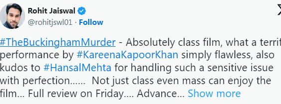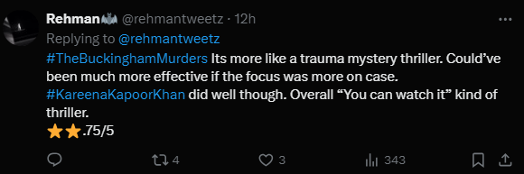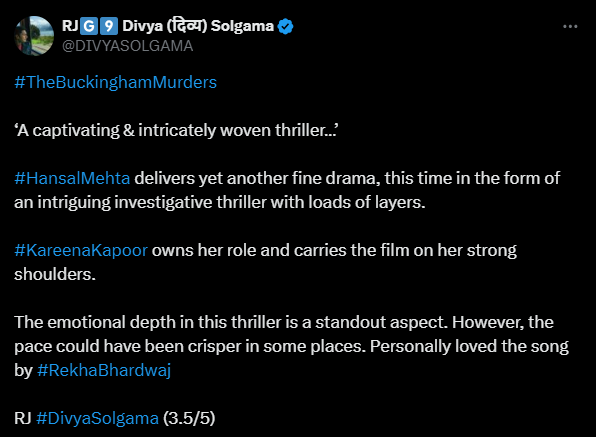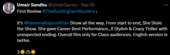 करीना कपूर और हंसल मेहता की इस मूवी को दर्शकों से मिली जुली प्रतिक्रिया मिल रही है। दूसरे यूजर ने लिखा, "द बकिंघम मर्डर्स एक ट्रॉमा मिस्ट्री थ्रिलर लग रही है, ये इससे ज्यादा इफेक्टिव हो सकती थी अगर फोकस केस पर होता तो। करीना कपूर ने अच्छा काम किया है, अगर आपको थ्रिलर फिल्में देखना पसंद है, तो आप ये मूवी देख सकते हैं"।