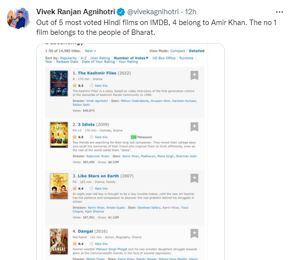 विवेक अग्निहोत्री सोशल मीडिया पर काफी सक्रिय हैं। वह अपने फैंस को 'द कश्मीर फाइल्स' से जुड़ी जानकारी भी शेयर करते रहते हैं। विवेक अग्निहोत्री ने अपने आधिकारिक ट्विटर अकाउंट पर IMDB की लिस्ट शेयर की है। इस लिस्ट में उनकी फिल्म 'द कश्मीर फाइल्स' नंबर एक पर है। वहीं आमिर खाम की चार फिल्में 3 इडियट्स दूसरे नंबर पर, तीसरे नंबर पर तारे जमीन पर, चौथे नंबर पर दंगल और पांचवें नंबर पर पीके है।