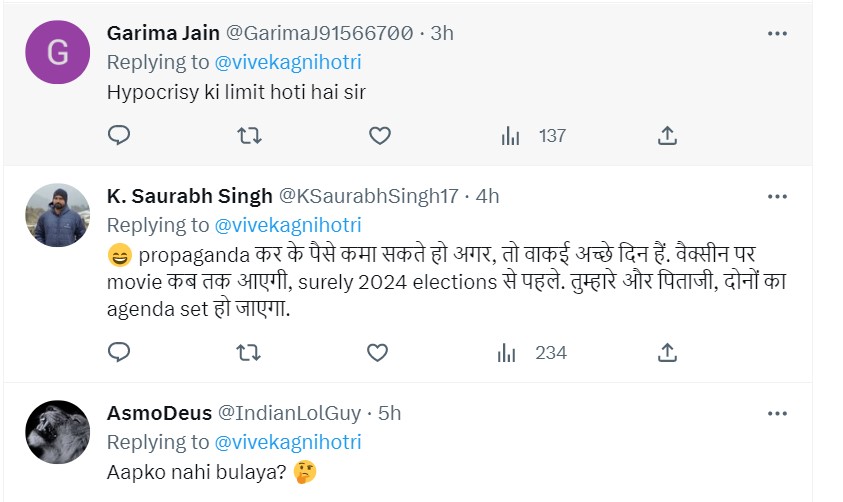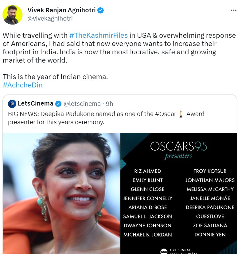 विवेक अग्निहोत्री ने ट्विटर पर अपनी प्रतिक्रिया देते हुए कहा, "द कश्मीर फाइल्स के साथ अमेरिका में यात्रा करने और उनकी जबरदस्त प्रतिक्रिया मिलने के दौरान मैंने कहा था कि हर कोई भारत में अपनी उपस्थिति बढ़ाना चाहता है। भारत अब दुनिया का सबसे आकर्षक, सुरक्षित और बढ़ता हुआ बाजार है। ये साल भारतीय सिनेमा का साल है। अच्छे दिन।"