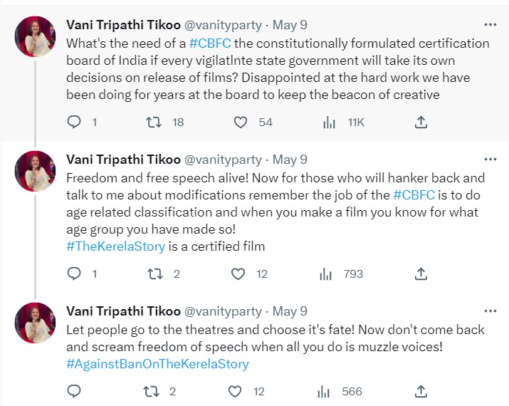 वाणी त्रिपाठी ने CBFC से द केरल स्टोरी को रिलीज की अनुमति मिलने के बाद बैन करने के फैसले को गलत बताया। न्यूज18 के साथ बातचीत में उन्होंने कहा, "आप दर्शकों के लोकतांत्रिक अधिकार को छीन रही हैं, जो फिल्म के भाग्य का तय करेंगे। आप इसका फैसला नहीं कर सकती हैं, मैं इसे तय नहीं कर सकती हूं, यहां तक कि डायरेक्टर भी तय नहीं कर सकते हैं। ये लोग होंगे जो तय करेंगे कि क्या फिल्म उनसे बात करती है, क्या ये डायरेक्टर की बातों को उनसे जोड़ती है।"