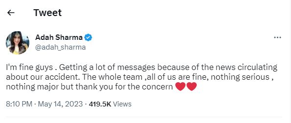 अदा शर्मा और डायरेक्टर सुदीप्तो सेन के रोड एक्सीडेंट की खबर जैसे ही सामने आई, वह देखते ही देखते वायरल हो गई। सोशल मीडिया पर इस खबर के सर्कुलेट होने के बाद अदा शर्मा ने ट्वीट करते हुए अपने स्वास्थ्य की जानकारी फैंस को दी।