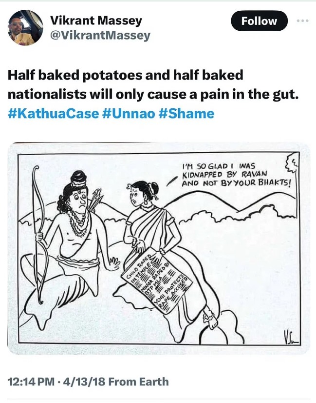 इस बीच एक पॉडकास्ट में बात करते हुए उन्हें 6 साल पुराने ट्वीट पर माफी मांगते हुए देखा गया जो सीता माता से जुड़ा हुआ था। दरअसल, विक्रांत मैसी ने साल 2018 में अपने ट्विटर अकाउंट पर एक कार्टून पोस्ट शेयर किया जिसमें श्रीराम और माता सीता की फीचर फोटो दिखाई गई थी। उनके इस ट्वीट पर यूजर्स काफी भड़के थे। एक्टर पर हिंदुओ की भावनाओं को आहत करने तक का आरोप लगा था इस ट्वीट पर एक बार फिर उन्होंने माफी मांगते हुए सफाई दी है।