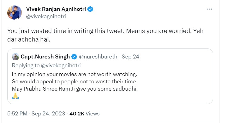 'द वैक्सीन वॉर' की रिलीज के चंद दिनों पहले उनकी फिल्मों को लेकर इस तरह का कमेंट जाहिर तौर पर विवेक अग्निहोत्री को अच्छा नहीं लगा। फिल्ममेकर भी शांत नहीं बैठे उन्होंने उन्होंने ट्वीट का जवाब देते हुए कहा, "तुमने इस ट्वीट को लिखने में अपना समय बर्बाद किया। इसका मतलब है कि तुम परेशान हो। ये डर अच्छा है।"