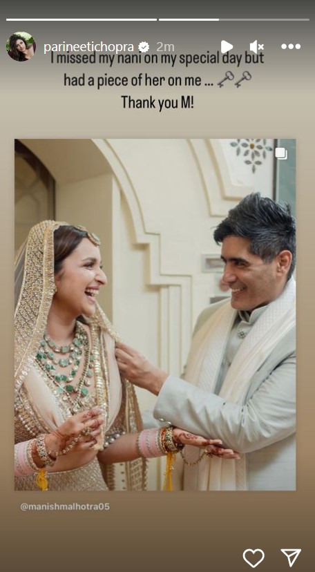 मनीष मल्होत्रा की कलाकारी ने परिणीति चोपड़ा का दिल जीत लिया। उन्होंने कहा कि वह अपने स्पेशल डे पर नानी को मिस कर रही थीं, लेकिन उनका एक हिस्सा अपने साथ लिए हुई थीं।