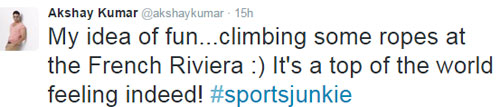 अक्षय कुमार ने अपनी यह फोटो ट्विटर और इंस्टाग्राम पर पोस्ट की है और इस फोटो में वह वाटर स्पोर्ट्स एक्टिविटीज का मजा लेते नजर आ रहे हैं। मगर यह हर किसी के बस की बात नहीं है। यह अक्षय कुमार के फन करने का स्टाइल है। उन्होंने इस फोटो के साथ ये ट्वीट किया है।