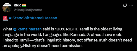 एक यूजर ने 'ठग लाइफ' एक्टर के बयान को लेकर माफी न मांगने के फैसले को सपोर्ट किया है। फैन ने लिखा, "कन्नड़ की भावनाओं का सम्मान करना जरूरी है, लेकिन तमिल का कन्नड़ भाषा पर इन्फ्लुएंस है, ये एक सच्चाई है, अपमान नहीं। कमल हासन की बात को गलत तरीके से लिया गया है। उनका माफी न मांगना अहंकार नहीं, बल्कि सिद्धांत है"।