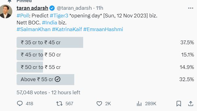 अब संडे यानी कि 12 नवंबर को रिलीज हो रही टाइगर 3 बॉक्स ऑफिस पर कितने करोड़ से ओपनिंग करेगी, इस पर भी दर्शकों ने अपनी राय दी है।