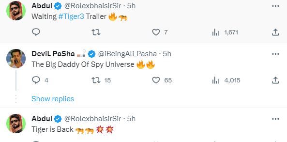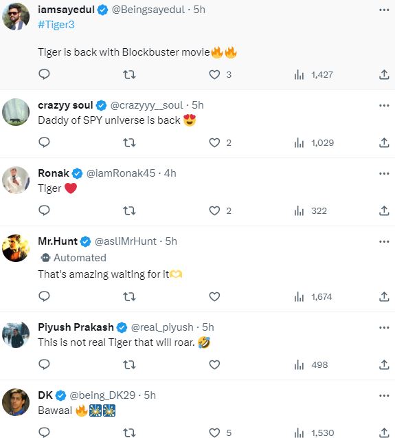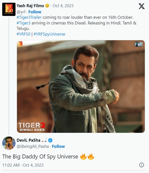 दूसरे यूजर ने लिखा, "स्पाई यूनिवर्स का बाप है टाइगर-3"। अन्य यूजर ने लिखा, "सुबह-सुबह ही भाई ने सरप्राइज दे दिया"।