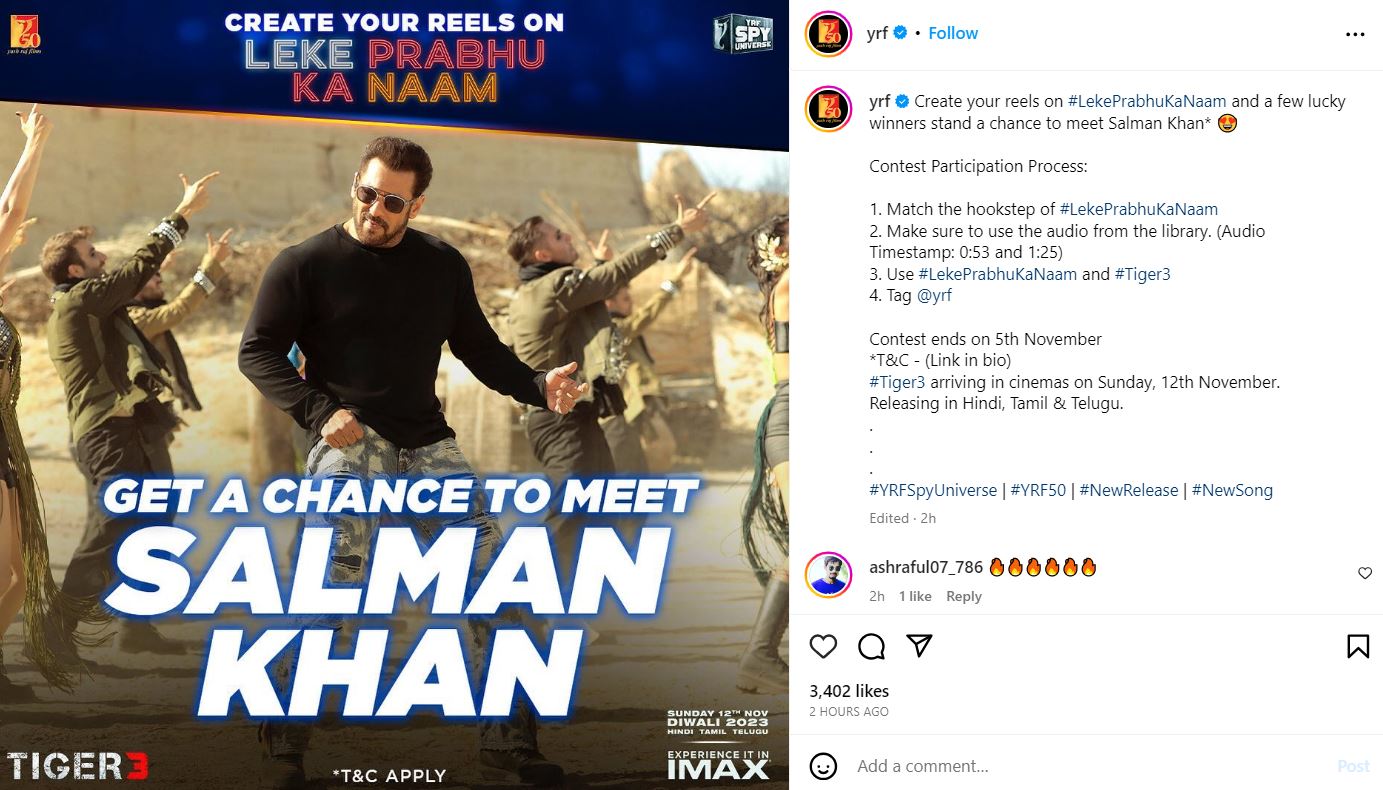 इस गाने में अरिजीत सिंह ने पहली बार सलमान खान के लिए अपनी आवाज दी थी। गाने में कटरीना कैफ (Katrina Kaif)के डांस मूव और सलमान के स्वैग को ऑडियंस ने पसंद किया था। अब हाल ही में मेकर्स ने फैंस को 'लेके प्रभु का नाम' गाने पर रील्स बनाने के लिए कहा, जो रील सबसे ज्यादा पसंद की जाएगी, उन कुछ लकी विनर्स को सलमान खान से मिलने का मौका मिलेगा।
