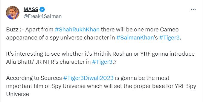लेकिन हाल ही में एक ऐसी खबर सामने आई है जिसे सुनकर आप खुशी से झूम उठेंगे। बॉलीवुड लाइफ में छपी रिपोर्ट्स के मुताबिक, सलमान खान की 'टाइगर-3' का हिस्सा सिर्फ शाह रुख खान ही नहीं, बल्कि ऋतिक रोशन, आलिया भट्ट और जूनियर एनटीआर में से एक और सुपरस्टार बन सकता है।