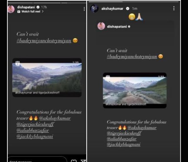 दिशा की इस इंस्टा स्टोरी को अक्षय कुमार ने भी इंस्टाग्राम पर शेयर कर उन्हें थैंक्यू बोला है। इस तरह से दिशा पाटनी ने बड़े मियां छोटे मियां के टीजर को लेकर अपना रिएक्शन दिया है।