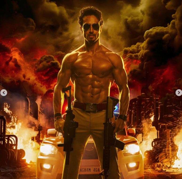 जिसमें उनके सिक्स पैक एब्स दिखाई दे रहे हैं और उन्होंने दोनों हाथ में बंदूक पकड़ी है और आंखों पर गॉगल्स चढ़ाया हुआ है। अन्य एक फोटो में पुलिस बेल्ट की हाथ हाथों में पकड़े टाइगर का क्लोज लुक शेयर किया गया है।