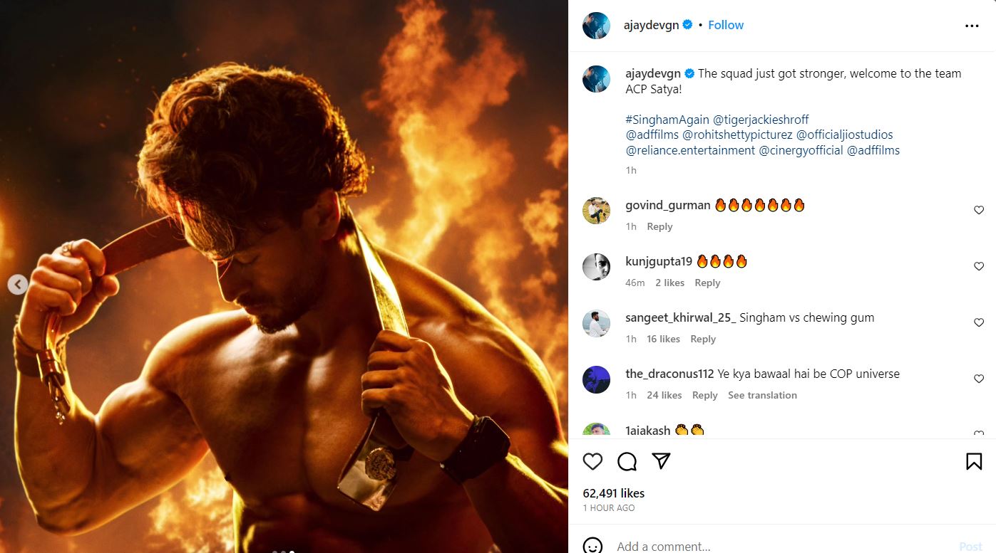 अजय देवगन ने टाइगर श्रॉफ (Tiger Shroff) के लुक को शेयर करते हुए लिखा, "ये टीम और भी मजबूत होती जा रही है। इस टीम में ACP सत्या आपका बहुत-बहुत स्वागत है"।