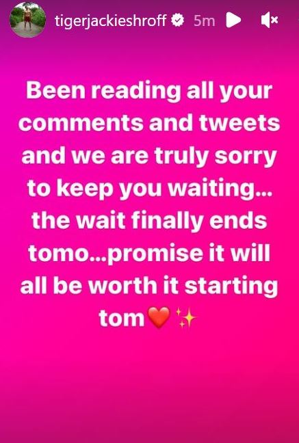 विकास बहल निर्देशित फिल्म 'गणपत पार्ट 1' में टाइगर श्रॉफ धमाल मचाते दिखाई देंगे। 17 सितंबर 2023 को टाइगर ने इंस्टाग्राम स्टोरी पर एक पोस्ट शेयर कर फैंस को बड़ा अपडेट दिया है। उन्होंने लिखा, "मैं आप सभी के कमेंट्स और ट्वीट्स पढ़ रहा हूं और आपको इंतजार कराने के लिए माफी मांगता हूं। इंतजार कल खत्म होगा। वादा करता हूं कि कल से इसकी शुरुआत करना सार्थक होगा।"