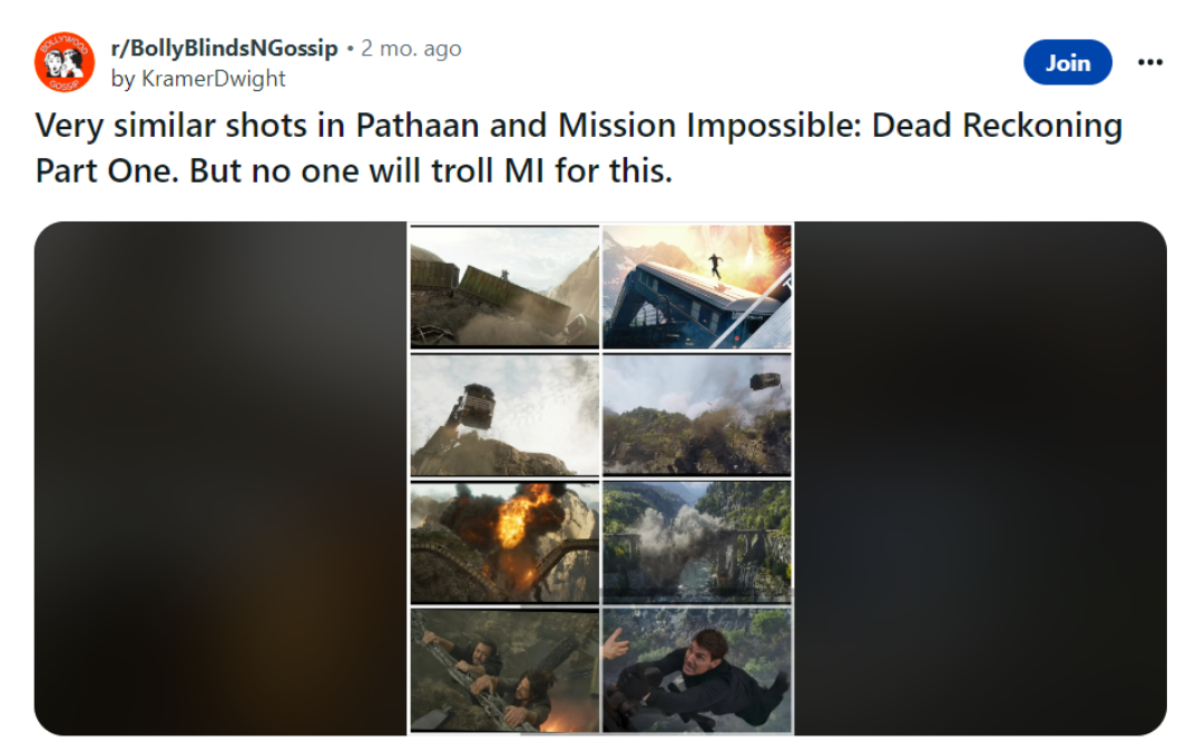 मिशन इम्पॉसिबल 7 का ट्रेलर आने के बाद इसके कुछ दृश्यों की तुलना शाह रुख खान की पठान से की गयी थी। आपको याद होगा, पठान में जब सलमान खान टाइगर के कैरेक्टर में उनकी मदद करने आते हैं तो एक स्थिति ऐसी आती है, जब दोनों को ट्रेन के ट्रेन नीचे खाई में गिरती है और दोनों छत की साइड पकड़कर लटके होते हैं। रेडिट पर यूजर ने इसे शेयर करते हुए लिखा था कि दोनों में कितनी समानता है, फिर भी कोई एमआइ 7 को ट्रोल नहीं करेगा।