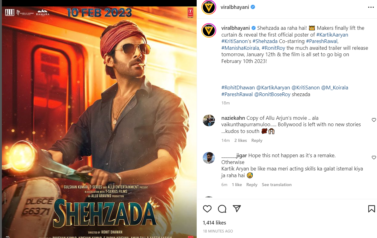 एक्टर ने खुद अपने इंस्टाग्राम पर एक पोस्ट शेयर किया है। कार्तिक ने फिल्म से अपना लुक शेयर करते हुए लिखा है, 'शहजादा आ रहा है। कल होगा ट्रेलर लॉन्च।' कार्तिक के लुक और अंदाज की बात करें तो मुंह में सिगरेट दबाए स्कूटर पर बैठे नजर आ रहे हैं। कार्तिक आर्यन की पोस्ट पर फैंस खुशी का इजहार करते नजर आ रहे हैं।