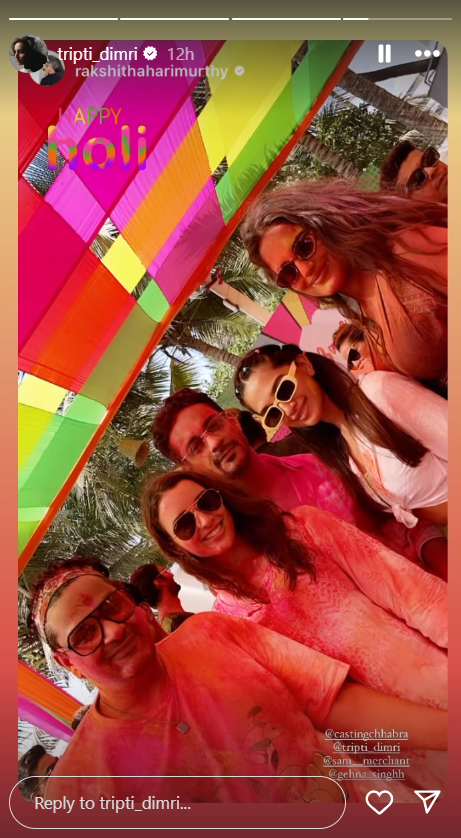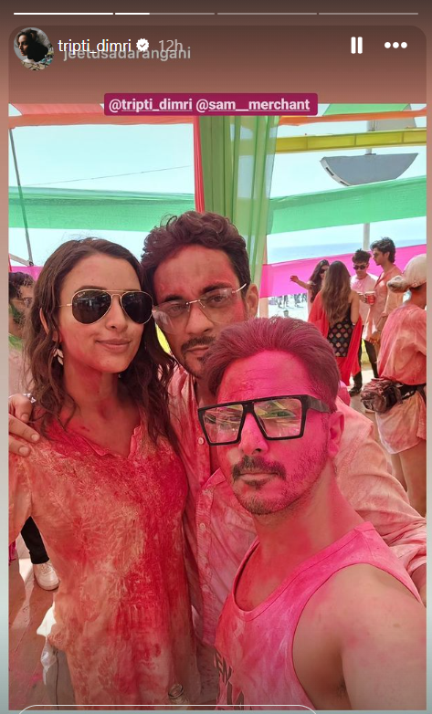 तृप्ति डिमरी (Triptii Dimri) एनिमल के बाद से लोगों के बीच छाई हुई है। प्रोफेशनल लाइफ के साथ-साथ एक्ट्रेस पर्सनल लाइफ की भी चर्चा में है। रिपोर्ट्स की माने तो एक्ट्रेस काफी समय से सैम मर्चेंट (Sam Merchant) को डेट कर रही हैं। अब दोनों ने मिलकर साथ होली भी खेली। तृप्ति ने इंस्टा स्टोरी पर फोटो साझा की हैं।