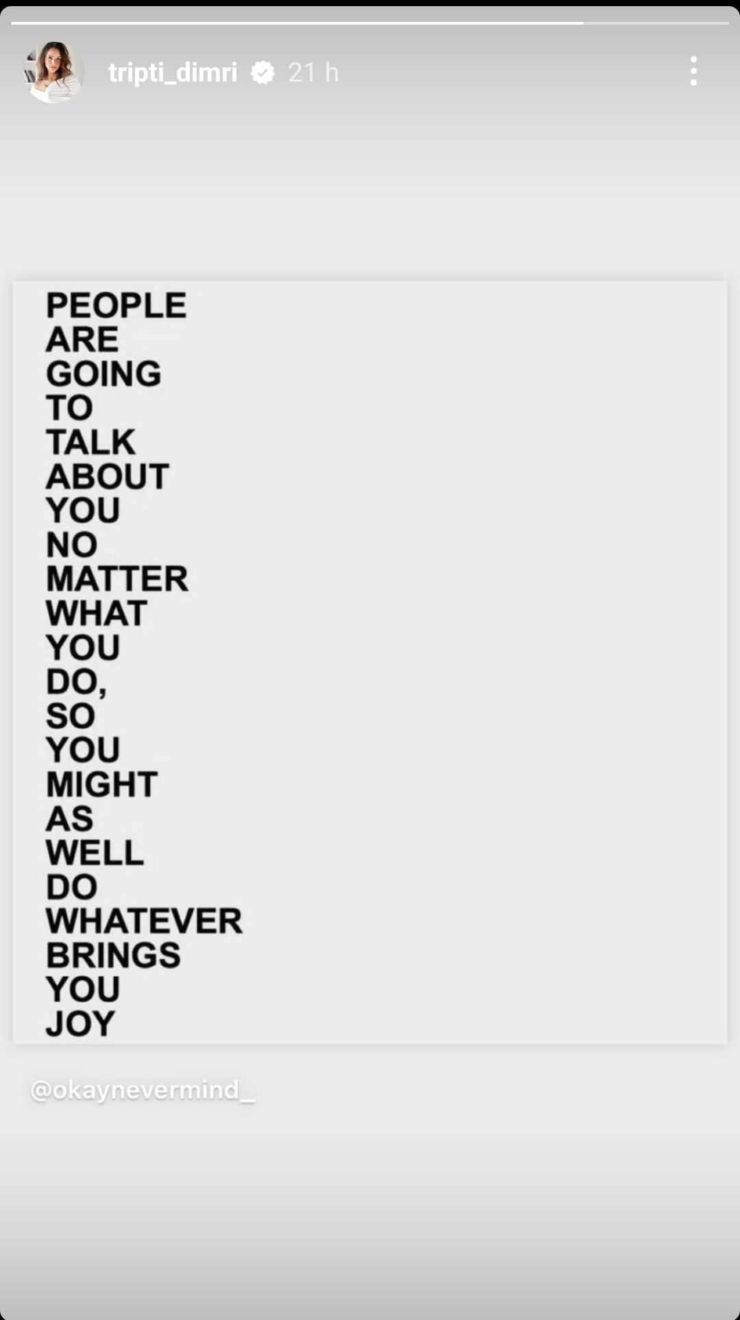 ब्रेकअप की खबरों के बीच एक्ट्रेस ने इंस्टाग्राम स्टोरी पर एक पोस्ट शेयर किया जिसमे लिखा था, "चाहे आप कुछ भी करें, लोग आपके बारे में बात करेंगे, इसलिए आप वहीं करें जो आपको खुशी दे।" इससे अलावा तृप्ति ने अपने वेकेशन की कुछ फोटोज भी साझा की है। बता दें, एक्ट्रेस इन दिनों मुंबई से कोसो दूर विदेश में वेकेशन मना रही हैं।