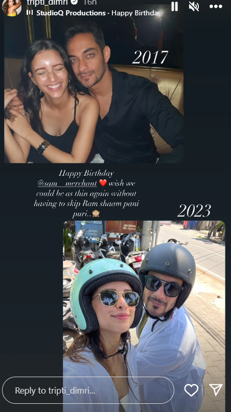 सैम मर्चेंट ने 30 जनवरी 2024 को अपना जन्मदिन सेलिब्रेट किया और तृप्ति डिमरी ने उन्हें सोशल मीडिया पर विश करते हुए। फोटो के कैप्शन में लिखा, "हैप्पी बर्थडे @sam__merchant (रेड हार्ट इमोजी) काश हम 'राम शाम' की पानी पूरी छोड़े बिना फिर से उतने ही पतले हो पाते।"
