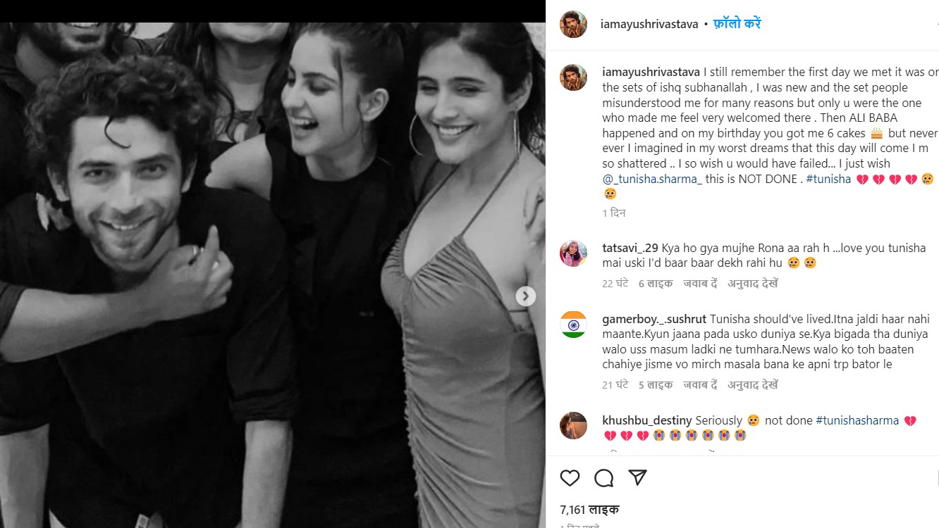 आयुष ने कुछ ही दिन पहले तुनिषा के साथ शूटिंग की थी। उनके निधन से दुखी आयुष श्रीवास्तव ने उनके लिए भावुक पोस्ट लिखा है। आयुष ने सोशल मीडिया प्लेटफॉर्म इंस्टाग्राम पर लिखा, 'मुझे आज भी वो दिन याद है जब हम इश्क सुभानअल्लाह के सेट पर मिले थे। मैं नया था और हर कोई मुझे बहुत सारे कारण से गलत समझ रहा था लेकिन सिर्फ तुम थी वहां जिसमें मुझे वेलकम फील कराया। फिर अली बाबा का शो हुआ और मेरे जन्मदिन पर तुम मेरे लिए छह केक लेकर आई लेकिन अपने बुरे से बुरे सपने में भी नहीं था कि यह भी एक दिन आएगा। मैं बहुत दुखी हूं। काश की तुम इसमें फेल हो जाती। मैं यही प्रार्थना करता हूं कि काश यह नहीं होता।'