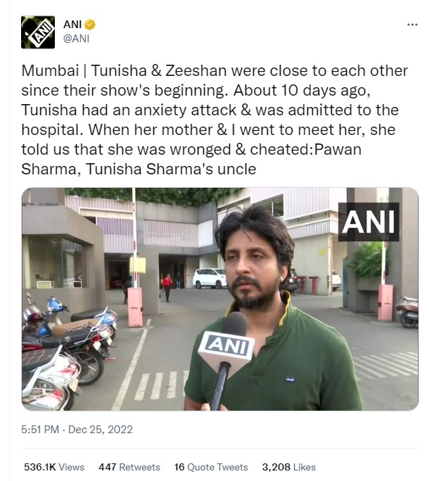 तुनिषा और शीजान के रिश्ते पर उनके को-स्टार्स और परिवार वालों के अलग-अलग बयान आए हैं। तुनिषा की मां ने शीजान खान को बेटी की मौत का जिम्मेदार ठहराया है। वहीं उनके अंकल पवन शर्मा न्यूज एजेंसी एएनआई को दिए बयान में बताया कि तुनिषा और शीजान शुरुआत से एक दूसरे के करीबी थे। लगभग 10 दिन पहले तुनिषा को एनजाइटी अटैक आया था और उसे अस्पताल में भर्ती किया गया था। जब उसकी मां और मैं उससे मिलने पहुंचे, तो उसमें हमे बताया कि उसके साथ गलत हुआ है। उसे चीट किया गया है।