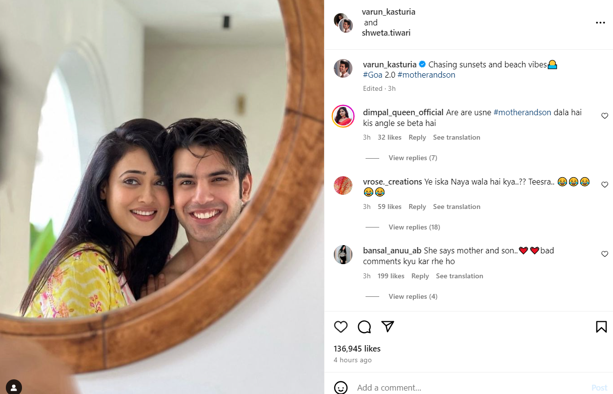 श्वेता तिवारी (Shweta Tiwari) इन दिनों गोवा में हैं और इस दौरान इंस्टा पर एक पोस्ट साझा किया है, जिसमें वह लड़के के साथ मिरर सेल्फी लेती दिखाई दे रही है। इस फोटो के कैप्शन में लिखा, सूर्यास्त और समुद्र तट की लहरों का पीछा करते हुए। इसके साथ एक्ट्रेस ने हैशटैग लगाते हुए मां और बेटा लिखा है। अब एक्ट्रेस की इस पोस्ट पर लोग तरह-तरह के कमेंट्स कर रहे हैं।