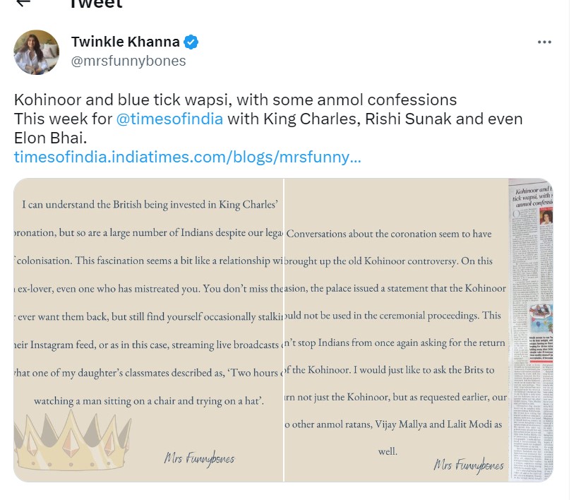 ट्विंकल खन्ना ने 6 मई को हुए किंग चार्ल्स तृतीय के कोरोनेशन में दिलचस्पी लेने वालों पर सीधे तौर पर हमला करते हुए एक पोस्ट शेयर किया। इसके अलावा उन्होंने कोहिनूर हीरे को भारत को वापस करने की मांग भी की। इसके साथ ही उन्होंने पोस्ट में विजय माल्या और ललित मोदी का नाम भी लिया।