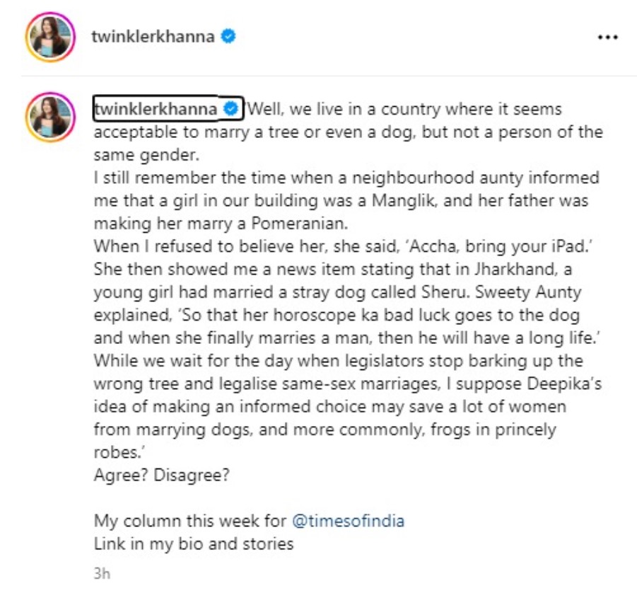 टाइम्स में छपे ट्विंकल खन्ना के कॉलम और अपने इंस्टाग्राम पर ट्विंकल ने दीपिका के सपोर्ट में पोस्ट शेयर करते हुए लोगों की सोच पर सवाल उठाए। उन्होंने इस बात पर हैरानी जताई कि इंडिया में एक डॉग या पेड़ से शादी करना लाजिमी हो सकता है, लेकिन सेम जेंडर के पर्सन से शादी करना नहीं। इसी के साथ उन्होंने दीपिका को ट्रोल करने वालों की भी क्लास लगाई।
