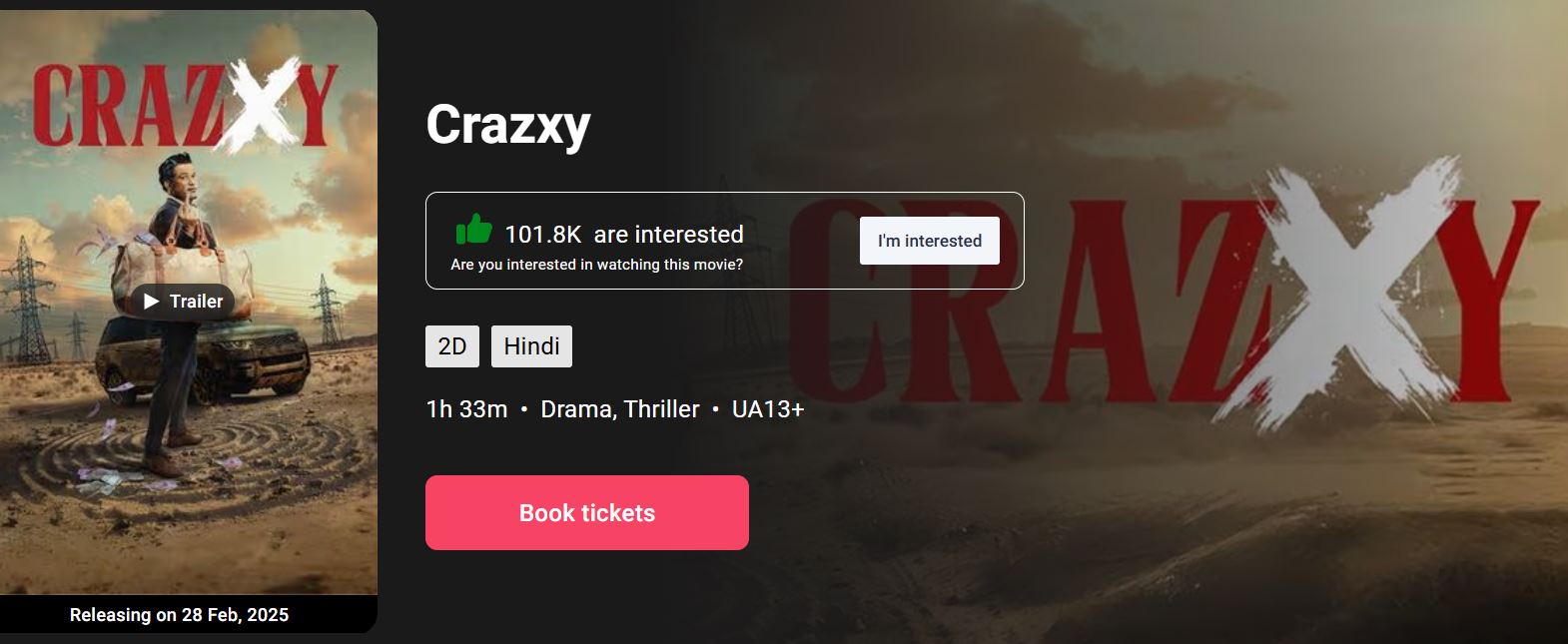 यूं तो 2025 में कई बड़ी फिल्में रिलीज होने वाली हैं, लेकिन इन दिनों दो मोस्ट एंटीसिपेटेड फिल्मों का क्रेज दर्शकों के सिर चढ़कर बोल रहा है। ऑनलाइन मूवी टिकट (Online Movie Ticket) बुक करने वाले ऐप बुक माय शो (Book My Show) पर तो इन दो मच अवेटेड फिल्मों के लिए दर्शकों के बीच बेताबी बढ़ गई है। यह दो फिल्में हैं क्रेजी (Crazxy) और सिकंदर (Sikandar)।